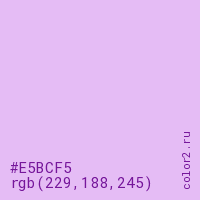Цвет #E5BCF5 в цветовой модели RGB обозначается тремя октетами (229, 188, 245) в десятичном формате и #E5BCF5 в шестнадцатиричном (hex) формате, которые являются интенсивностью красного 229 (hex E5), интенсивность зелёного 188 (hex BC) и интенсивность синего 245 (hex F5).