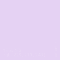 Цвет #E5D2F3 в цветовой модели RGB обозначается тремя октетами (229, 210, 243) в десятичном формате и #E5D2F3 в шестнадцатиричном (hex) формате, которые являются интенсивностью красного 229 (hex E5), интенсивность зелёного 210 (hex D2) и интенсивность синего 243 (hex F3).