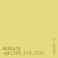 Цвет #E5DA7D в цветовой модели RGB обозначается тремя октетами (229, 218, 125) в десятичном формате и #E5DA7D в шестнадцатиричном (hex) формате, которые являются интенсивностью красного 229 (hex E5), интенсивность зелёного 218 (hex DA) и интенсивность синего 125 (hex 7D).