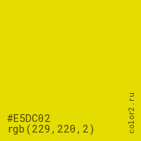 Цвет #E5DC02 в цветовой модели RGB обозначается тремя октетами (229, 220, 2) в десятичном формате и #E5DC02 в шестнадцатиричном (hex) формате, которые являются интенсивностью красного 229 (hex E5), интенсивность зелёного 220 (hex DC) и интенсивность синего 2 (hex 02).