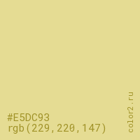 Цвет #E5DC93 в цветовой модели RGB обозначается тремя октетами (229, 220, 147) в десятичном формате и #E5DC93 в шестнадцатиричном (hex) формате, которые являются интенсивностью красного 229 (hex E5), интенсивность зелёного 220 (hex DC) и интенсивность синего 147 (hex 93).