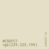 Цвет #E5DFC7 в цветовой модели RGB обозначается тремя октетами (229, 223, 199) в десятичном формате и #E5DFC7 в шестнадцатиричном (hex) формате, которые являются интенсивностью красного 229 (hex E5), интенсивность зелёного 223 (hex DF) и интенсивность синего 199 (hex C7).