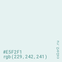 Цвет #E5F2F1 в цветовой модели RGB обозначается тремя октетами (229, 242, 241) в десятичном формате и #E5F2F1 в шестнадцатиричном (hex) формате, которые являются интенсивностью красного 229 (hex E5), интенсивность зелёного 242 (hex F2) и интенсивность синего 241 (hex F1).