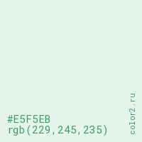 Цвет #E5F5EB в цветовой модели RGB обозначается тремя октетами (229, 245, 235) в десятичном формате и #E5F5EB в шестнадцатиричном (hex) формате, которые являются интенсивностью красного 229 (hex E5), интенсивность зелёного 245 (hex F5) и интенсивность синего 235 (hex EB).