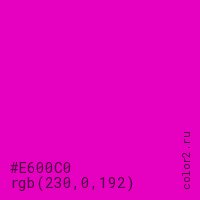 Цвет #E600C0 в цветовой модели RGB обозначается тремя октетами (230, 0, 192) в десятичном формате и #E600C0 в шестнадцатиричном (hex) формате, которые являются интенсивностью красного 230 (hex E6), интенсивность зелёного 0 (hex 00) и интенсивность синего 192 (hex C0).