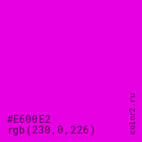 Цвет #E600E2 в цветовой модели RGB обозначается тремя октетами (230, 0, 226) в десятичном формате и #E600E2 в шестнадцатиричном (hex) формате, которые являются интенсивностью красного 230 (hex E6), интенсивность зелёного 0 (hex 00) и интенсивность синего 226 (hex E2).