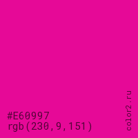Цвет #E60997 в цветовой модели RGB обозначается тремя октетами (230, 9, 151) в десятичном формате и #E60997 в шестнадцатиричном (hex) формате, которые являются интенсивностью красного 230 (hex E6), интенсивность зелёного 9 (hex 09) и интенсивность синего 151 (hex 97).