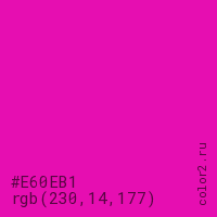Цвет #E60EB1 в цветовой модели RGB обозначается тремя октетами (230, 14, 177) в десятичном формате и #E60EB1 в шестнадцатиричном (hex) формате, которые являются интенсивностью красного 230 (hex E6), интенсивность зелёного 14 (hex 0E) и интенсивность синего 177 (hex B1).