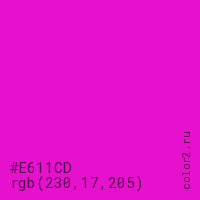 Цвет #E611CD в цветовой модели RGB обозначается тремя октетами (230, 17, 205) в десятичном формате и #E611CD в шестнадцатиричном (hex) формате, которые являются интенсивностью красного 230 (hex E6), интенсивность зелёного 17 (hex 11) и интенсивность синего 205 (hex CD).