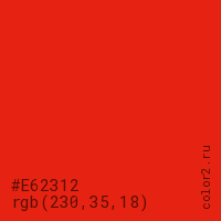 Цвет #E62312 в цветовой модели RGB обозначается тремя октетами (230, 35, 18) в десятичном формате и #E62312 в шестнадцатиричном (hex) формате, которые являются интенсивностью красного 230 (hex E6), интенсивность зелёного 35 (hex 23) и интенсивность синего 18 (hex 12).