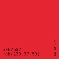 Цвет #E62532 в цветовой модели RGB обозначается тремя октетами (230, 37, 50) в десятичном формате и #E62532 в шестнадцатиричном (hex) формате, которые являются интенсивностью красного 230 (hex E6), интенсивность зелёного 37 (hex 25) и интенсивность синего 50 (hex 32).