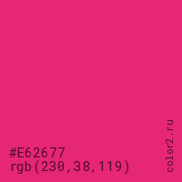 Цвет #E62677 в цветовой модели RGB обозначается тремя октетами (230, 38, 119) в десятичном формате и #E62677 в шестнадцатиричном (hex) формате, которые являются интенсивностью красного 230 (hex E6), интенсивность зелёного 38 (hex 26) и интенсивность синего 119 (hex 77).