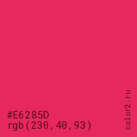 Цвет #E6285D в цветовой модели RGB обозначается тремя октетами (230, 40, 93) в десятичном формате и #E6285D в шестнадцатиричном (hex) формате, которые являются интенсивностью красного 230 (hex E6), интенсивность зелёного 40 (hex 28) и интенсивность синего 93 (hex 5D).