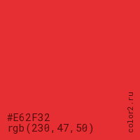Цвет #E62F32 в цветовой модели RGB обозначается тремя октетами (230, 47, 50) в десятичном формате и #E62F32 в шестнадцатиричном (hex) формате, которые являются интенсивностью красного 230 (hex E6), интенсивность зелёного 47 (hex 2F) и интенсивность синего 50 (hex 32).