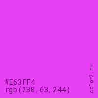 Цвет #E63FF4 в цветовой модели RGB обозначается тремя октетами (230, 63, 244) в десятичном формате и #E63FF4 в шестнадцатиричном (hex) формате, которые являются интенсивностью красного 230 (hex E6), интенсивность зелёного 63 (hex 3F) и интенсивность синего 244 (hex F4).