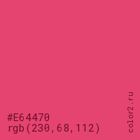 Цвет #E64470 в цветовой модели RGB обозначается тремя октетами (230, 68, 112) в десятичном формате и #E64470 в шестнадцатиричном (hex) формате, которые являются интенсивностью красного 230 (hex E6), интенсивность зелёного 68 (hex 44) и интенсивность синего 112 (hex 70).
