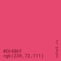 Цвет #E6486F в цветовой модели RGB обозначается тремя октетами (230, 72, 111) в десятичном формате и #E6486F в шестнадцатиричном (hex) формате, которые являются интенсивностью красного 230 (hex E6), интенсивность зелёного 72 (hex 48) и интенсивность синего 111 (hex 6F).