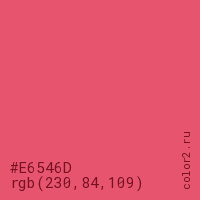 Цвет #E6546D в цветовой модели RGB обозначается тремя октетами (230, 84, 109) в десятичном формате и #E6546D в шестнадцатиричном (hex) формате, которые являются интенсивностью красного 230 (hex E6), интенсивность зелёного 84 (hex 54) и интенсивность синего 109 (hex 6D).