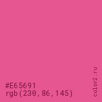 Цвет #E65691 в цветовой модели RGB обозначается тремя октетами (230, 86, 145) в десятичном формате и #E65691 в шестнадцатиричном (hex) формате, которые являются интенсивностью красного 230 (hex E6), интенсивность зелёного 86 (hex 56) и интенсивность синего 145 (hex 91).