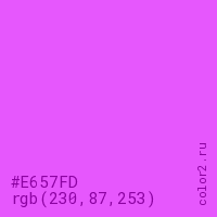 Цвет #E657FD в цветовой модели RGB обозначается тремя октетами (230, 87, 253) в десятичном формате и #E657FD в шестнадцатиричном (hex) формате, которые являются интенсивностью красного 230 (hex E6), интенсивность зелёного 87 (hex 57) и интенсивность синего 253 (hex FD).