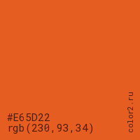 Цвет #E65D22 в цветовой модели RGB обозначается тремя октетами (230, 93, 34) в десятичном формате и #E65D22 в шестнадцатиричном (hex) формате, которые являются интенсивностью красного 230 (hex E6), интенсивность зелёного 93 (hex 5D) и интенсивность синего 34 (hex 22).