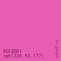 Цвет #E65DB1 в цветовой модели RGB обозначается тремя октетами (230, 93, 177) в десятичном формате и #E65DB1 в шестнадцатиричном (hex) формате, которые являются интенсивностью красного 230 (hex E6), интенсивность зелёного 93 (hex 5D) и интенсивность синего 177 (hex B1).