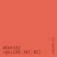 Цвет #E66552 в цветовой модели RGB обозначается тремя октетами (230, 101, 82) в десятичном формате и #E66552 в шестнадцатиричном (hex) формате, которые являются интенсивностью красного 230 (hex E6), интенсивность зелёного 101 (hex 65) и интенсивность синего 82 (hex 52).