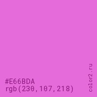 Цвет #E66BDA в цветовой модели RGB обозначается тремя октетами (230, 107, 218) в десятичном формате и #E66BDA в шестнадцатиричном (hex) формате, которые являются интенсивностью красного 230 (hex E6), интенсивность зелёного 107 (hex 6B) и интенсивность синего 218 (hex DA).