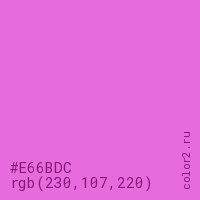 Цвет #E66BDC в цветовой модели RGB обозначается тремя октетами (230, 107, 220) в десятичном формате и #E66BDC в шестнадцатиричном (hex) формате, которые являются интенсивностью красного 230 (hex E6), интенсивность зелёного 107 (hex 6B) и интенсивность синего 220 (hex DC).
