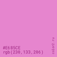 Цвет #E685CE в цветовой модели RGB обозначается тремя октетами (230, 133, 206) в десятичном формате и #E685CE в шестнадцатиричном (hex) формате, которые являются интенсивностью красного 230 (hex E6), интенсивность зелёного 133 (hex 85) и интенсивность синего 206 (hex CE).