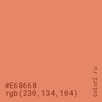 Цвет #E68668 в цветовой модели RGB обозначается тремя октетами (230, 134, 104) в десятичном формате и #E68668 в шестнадцатиричном (hex) формате, которые являются интенсивностью красного 230 (hex E6), интенсивность зелёного 134 (hex 86) и интенсивность синего 104 (hex 68).