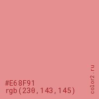 Цвет #E68F91 в цветовой модели RGB обозначается тремя октетами (230, 143, 145) в десятичном формате и #E68F91 в шестнадцатиричном (hex) формате, которые являются интенсивностью красного 230 (hex E6), интенсивность зелёного 143 (hex 8F) и интенсивность синего 145 (hex 91).