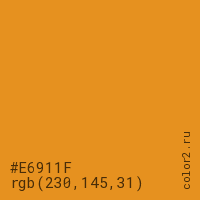 Цвет #E6911F в цветовой модели RGB обозначается тремя октетами (230, 145, 31) в десятичном формате и #E6911F в шестнадцатиричном (hex) формате, которые являются интенсивностью красного 230 (hex E6), интенсивность зелёного 145 (hex 91) и интенсивность синего 31 (hex 1F).
