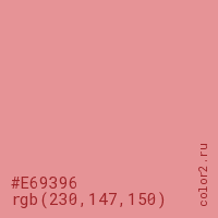 Цвет #E69396 в цветовой модели RGB обозначается тремя октетами (230, 147, 150) в десятичном формате и #E69396 в шестнадцатиричном (hex) формате, которые являются интенсивностью красного 230 (hex E6), интенсивность зелёного 147 (hex 93) и интенсивность синего 150 (hex 96).