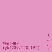 Цвет #E694BF в цветовой модели RGB обозначается тремя октетами (230, 148, 191) в десятичном формате и #E694BF в шестнадцатиричном (hex) формате, которые являются интенсивностью красного 230 (hex E6), интенсивность зелёного 148 (hex 94) и интенсивность синего 191 (hex BF).