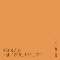 Цвет #E69751 в цветовой модели RGB обозначается тремя октетами (230, 151, 81) в десятичном формате и #E69751 в шестнадцатиричном (hex) формате, которые являются интенсивностью красного 230 (hex E6), интенсивность зелёного 151 (hex 97) и интенсивность синего 81 (hex 51).