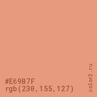 Цвет #E69B7F в цветовой модели RGB обозначается тремя октетами (230, 155, 127) в десятичном формате и #E69B7F в шестнадцатиричном (hex) формате, которые являются интенсивностью красного 230 (hex E6), интенсивность зелёного 155 (hex 9B) и интенсивность синего 127 (hex 7F).