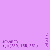 Цвет #E69BFB в цветовой модели RGB обозначается тремя октетами (230, 155, 251) в десятичном формате и #E69BFB в шестнадцатиричном (hex) формате, которые являются интенсивностью красного 230 (hex E6), интенсивность зелёного 155 (hex 9B) и интенсивность синего 251 (hex FB).
