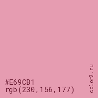 Цвет #E69CB1 в цветовой модели RGB обозначается тремя октетами (230, 156, 177) в десятичном формате и #E69CB1 в шестнадцатиричном (hex) формате, которые являются интенсивностью красного 230 (hex E6), интенсивность зелёного 156 (hex 9C) и интенсивность синего 177 (hex B1).