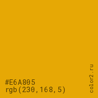 Цвет #E6A805 в цветовой модели RGB обозначается тремя октетами (230, 168, 5) в десятичном формате и #E6A805 в шестнадцатиричном (hex) формате, которые являются интенсивностью красного 230 (hex E6), интенсивность зелёного 168 (hex A8) и интенсивность синего 5 (hex 05).