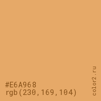 Цвет #E6A968 в цветовой модели RGB обозначается тремя октетами (230, 169, 104) в десятичном формате и #E6A968 в шестнадцатиричном (hex) формате, которые являются интенсивностью красного 230 (hex E6), интенсивность зелёного 169 (hex A9) и интенсивность синего 104 (hex 68).