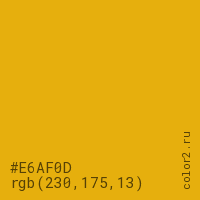 Цвет #E6AF0D в цветовой модели RGB обозначается тремя октетами (230, 175, 13) в десятичном формате и #E6AF0D в шестнадцатиричном (hex) формате, которые являются интенсивностью красного 230 (hex E6), интенсивность зелёного 175 (hex AF) и интенсивность синего 13 (hex 0D).