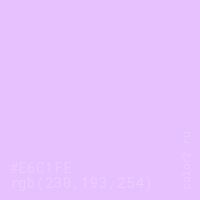 Цвет #E6C1FE в цветовой модели RGB обозначается тремя октетами (230, 193, 254) в десятичном формате и #E6C1FE в шестнадцатиричном (hex) формате, которые являются интенсивностью красного 230 (hex E6), интенсивность зелёного 193 (hex C1) и интенсивность синего 254 (hex FE).