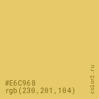 Цвет #E6C968 в цветовой модели RGB обозначается тремя октетами (230, 201, 104) в десятичном формате и #E6C968 в шестнадцатиричном (hex) формате, которые являются интенсивностью красного 230 (hex E6), интенсивность зелёного 201 (hex C9) и интенсивность синего 104 (hex 68).