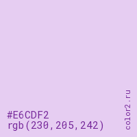 Цвет #E6CDF2 в цветовой модели RGB обозначается тремя октетами (230, 205, 242) в десятичном формате и #E6CDF2 в шестнадцатиричном (hex) формате, которые являются интенсивностью красного 230 (hex E6), интенсивность зелёного 205 (hex CD) и интенсивность синего 242 (hex F2).