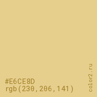 Цвет #E6CE8D в цветовой модели RGB обозначается тремя октетами (230, 206, 141) в десятичном формате и #E6CE8D в шестнадцатиричном (hex) формате, которые являются интенсивностью красного 230 (hex E6), интенсивность зелёного 206 (hex CE) и интенсивность синего 141 (hex 8D).