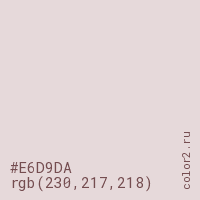 Цвет #E6D9DA в цветовой модели RGB обозначается тремя октетами (230, 217, 218) в десятичном формате и #E6D9DA в шестнадцатиричном (hex) формате, которые являются интенсивностью красного 230 (hex E6), интенсивность зелёного 217 (hex D9) и интенсивность синего 218 (hex DA).