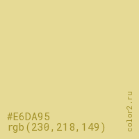 Цвет #E6DA95 в цветовой модели RGB обозначается тремя октетами (230, 218, 149) в десятичном формате и #E6DA95 в шестнадцатиричном (hex) формате, которые являются интенсивностью красного 230 (hex E6), интенсивность зелёного 218 (hex DA) и интенсивность синего 149 (hex 95).