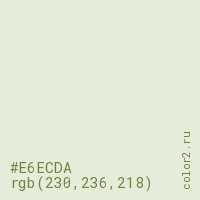 Цвет RGB(230, 236, 218) в процентом отношении количества цвета состоит из 90.2% красного (red), 92.5% зелёного (green) и 85.5% синего (blue).