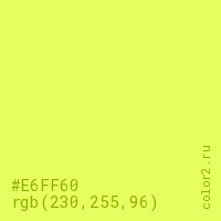 Цвет #E6FF60 в цветовой модели RGB обозначается тремя октетами (230, 255, 96) в десятичном формате и #E6FF60 в шестнадцатиричном (hex) формате, которые являются интенсивностью красного 230 (hex E6), интенсивность зелёного 255 (hex FF) и интенсивность синего 96 (hex 60).